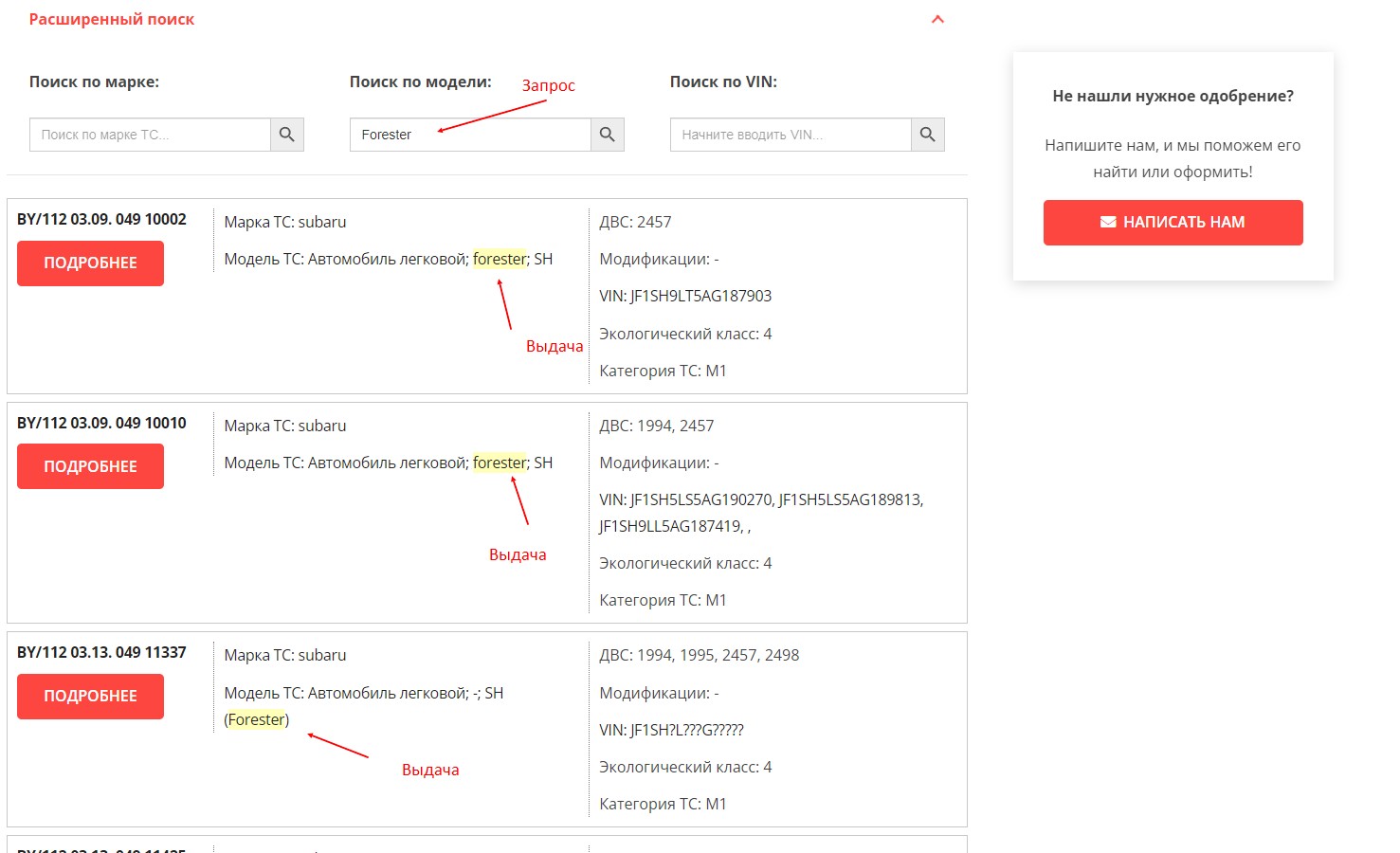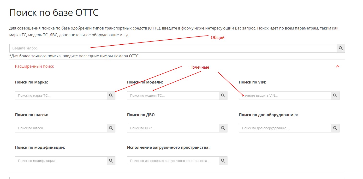 - Точечный, который осуществляет поиск только по тому полю, к которому он относится, например, модель ТС или VIN код.